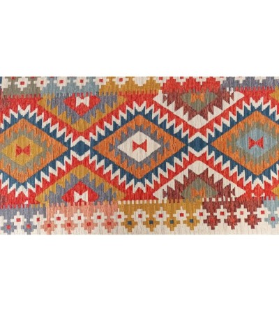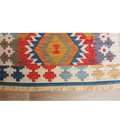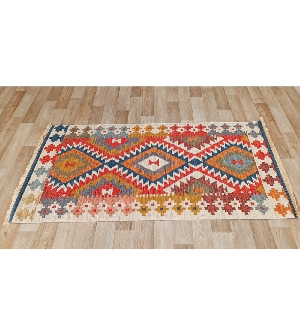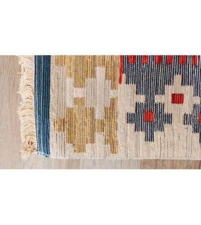 Alfombra colorida estilo étnica con flecos en los laterales.